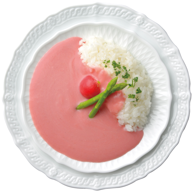 まるで絵の具をこぼしたような鮮やかなピンクに、初めて食べる人は困惑することでしょう。でも、ちゃんと食べられるのです。もちろん味はしっかりとしたおいしいカレーそのもの。お皿の上にライスをのせ、お好みの食材をトッピング。その上に「恋のピンク華麗」をかけるだけで、いつもとは違う新しいカレーライスが誕生します!
